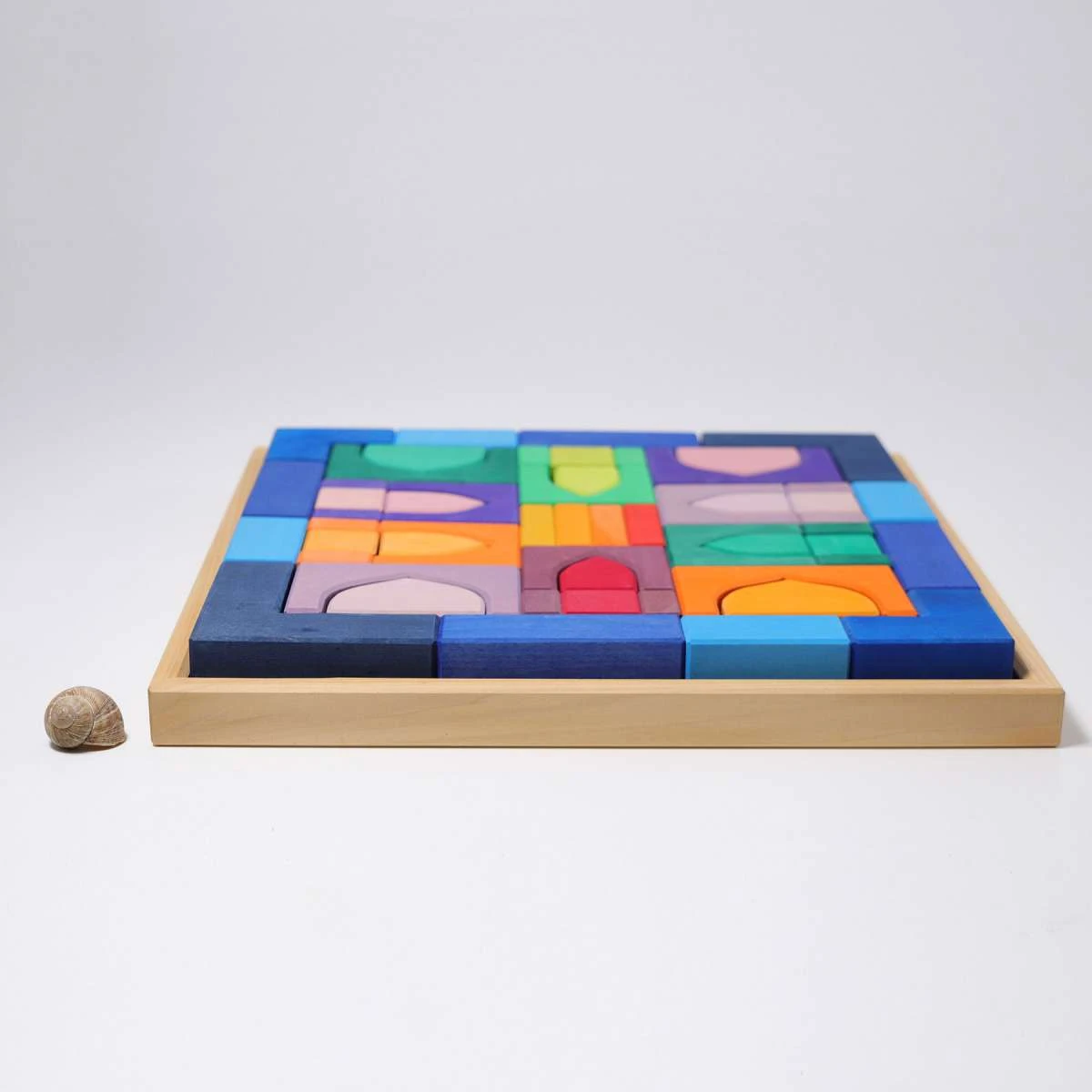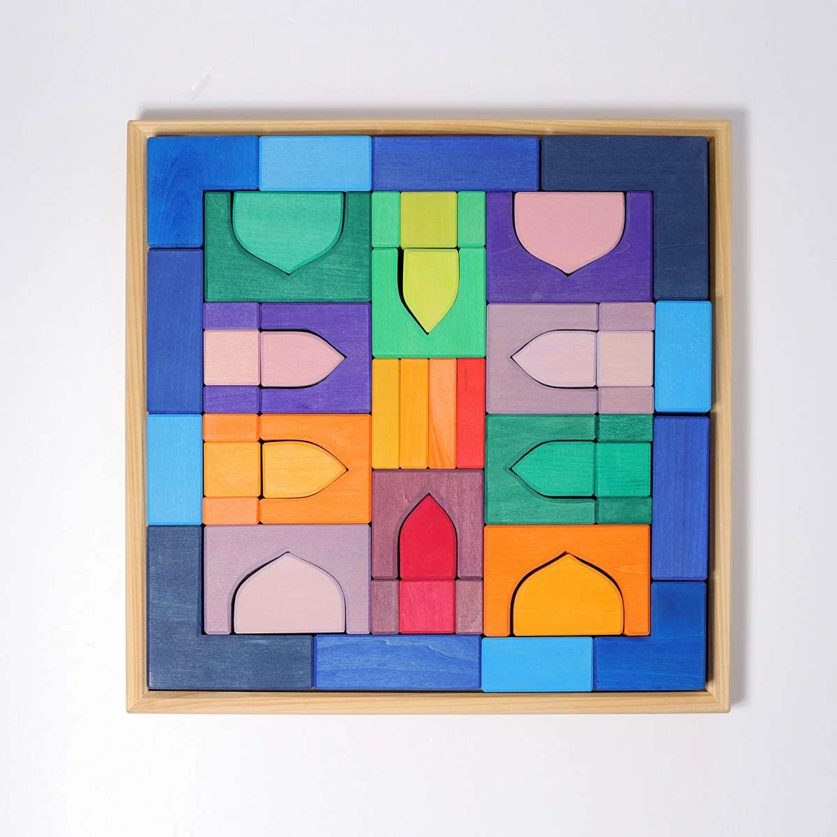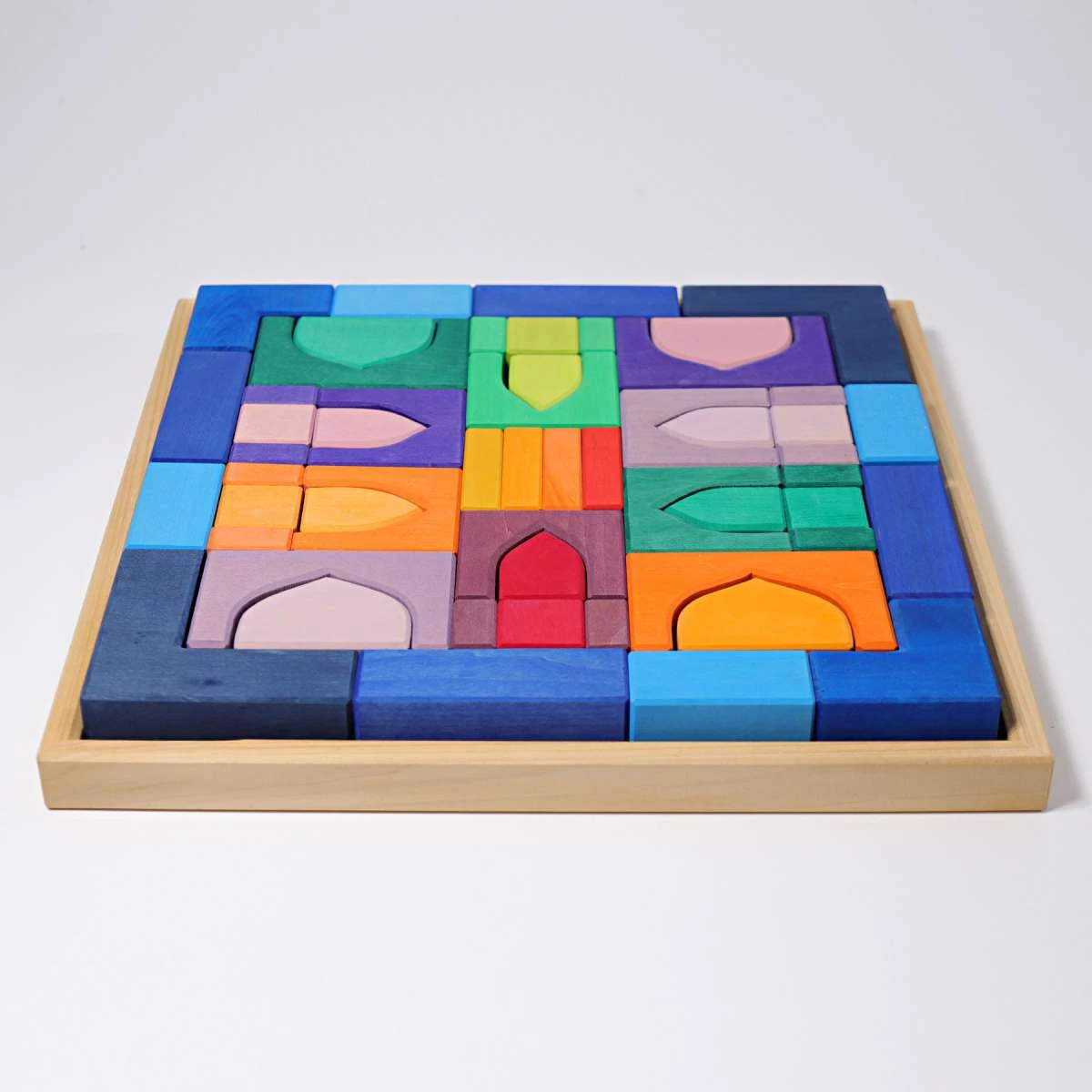 Experience the world of 1001 nights! Even younger children will be fascinated by the intense colours and beautifully formed elements. As the children get older, they will create more and more detailed palaces. Create more mystery and wonder with this building set when combined with glass stones, silk scarves, dolls and other elements. By building and playing with these blocks, children develop fine motor skills and spatial thinking skills. 54 buidling blocks in wooden frame. Materials: lime wood, non-toxic water based color stain/non-toxic plant based oil finish. Size: frame length 44,5cm, single blocks 4cm thickness, height 2-12cm.
