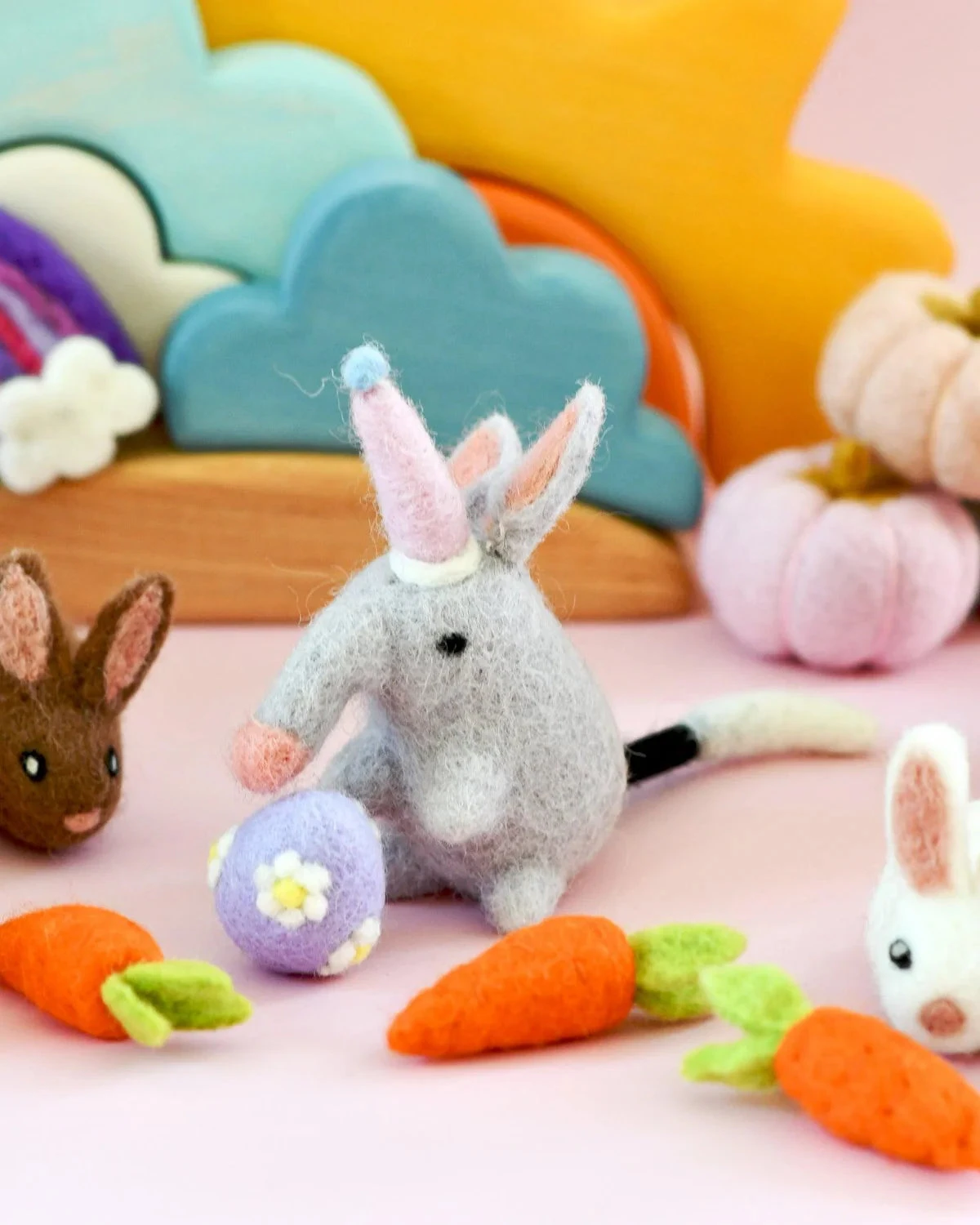 How adorable is this Felt Bilby Toy, which comes with a cute little party hat! Check out the needle-felted details on the ears and tail. Perfect for small world play and loose parts play.