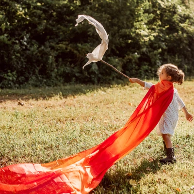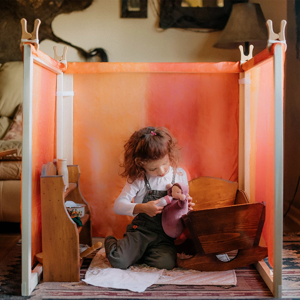 Sometimes toys that get the most play from children do not appear immediately to the adult as a toy, yet they become very much cherished and played with everyday. This large playscape is one of those “toys”. Not only is the purple and pink colour inviting and cheerful, the large size and length ( 3 feet by 9 feet long) of the playscapes makes it very useful for so many types of imaginative play. Below are some suggestions by Sarah Lee from Sarah Silks but no doubt there are many more ideas for this versatile play scape.