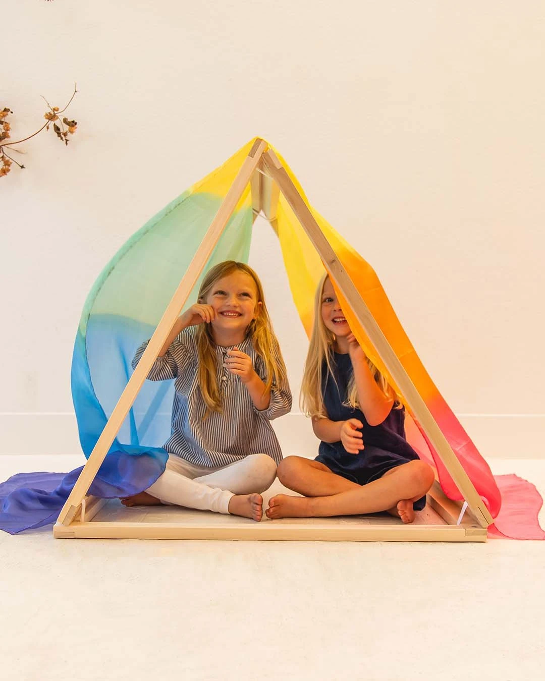 Sometimes toys that get the most play from children do not appear immediately to the adult as a toy, yet they become very much cherished and played with everyday. This large playscape is one of those “toys”. Not only is the rainbow colour inviting and cheerful, the large size and length ( 3 feet by 9 feet long) of the playscapes makes it very useful for so many types of imaginative play. Below are some suggestions by Sarah Lee from Sarah Silks but no doubt there are many more ideas for this versatile play scape.