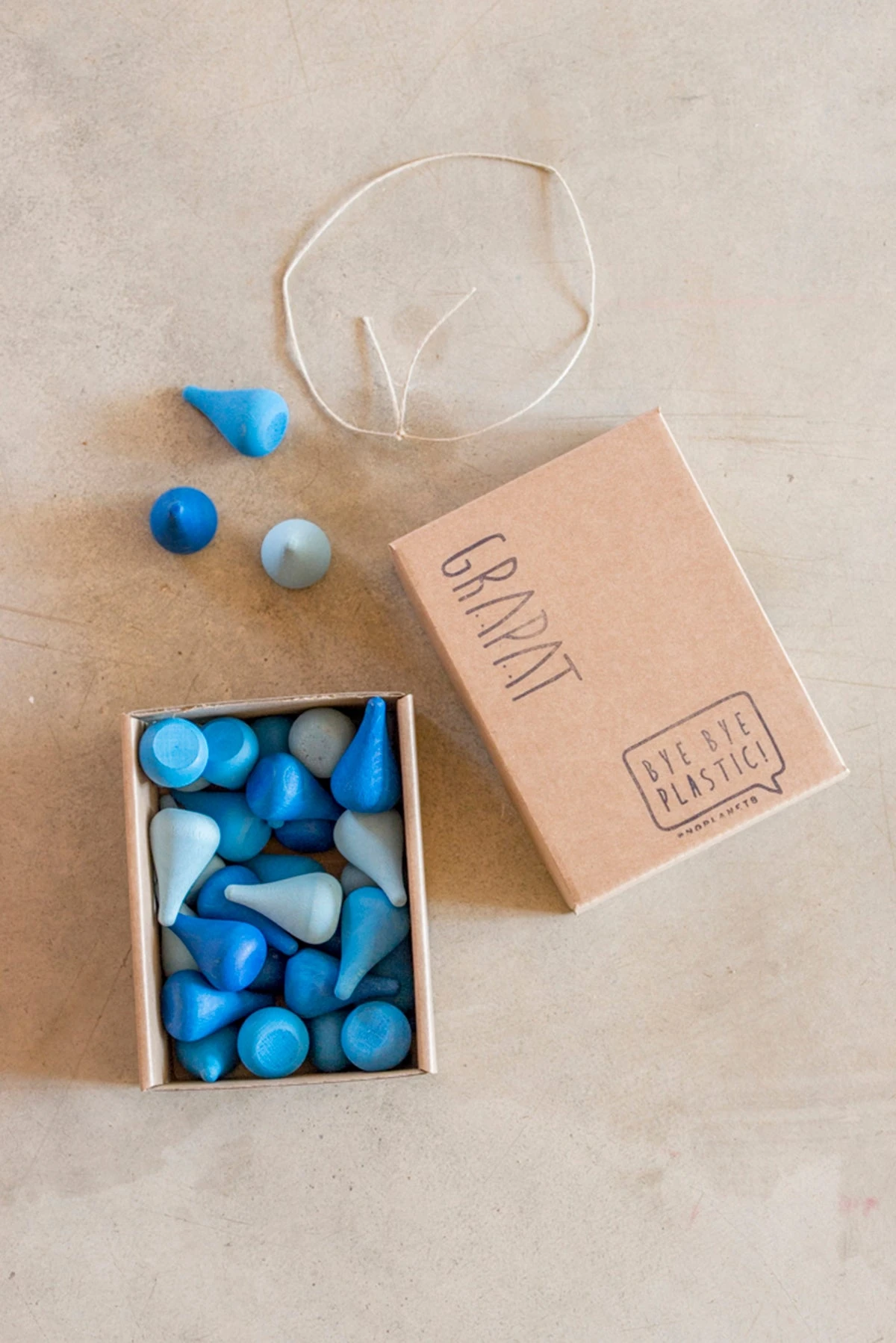 Contains: 36 small wooden raindrops in 3 shades of blue