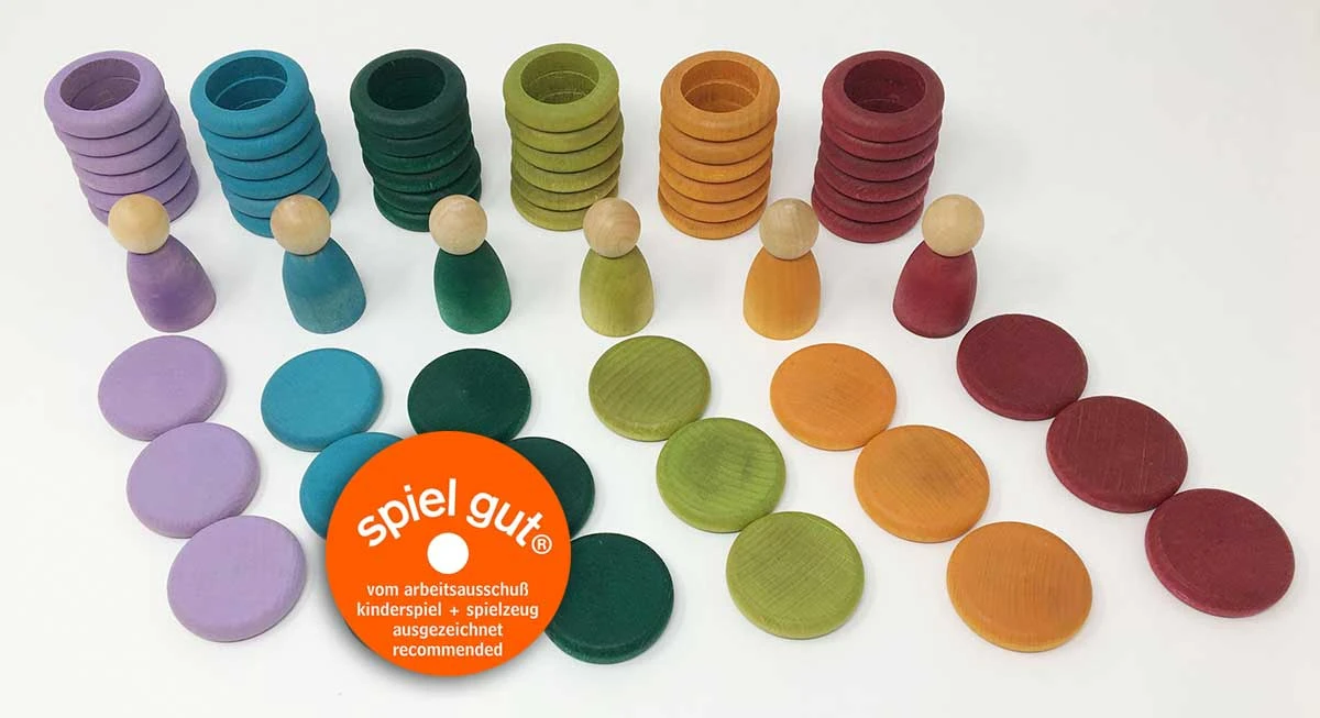 This Grapat Nins, Rings and Coins set contains 6 beautiful subtle colours. The Nins can be completely hidden, and slowly revealed, by the circular rings. Children can enjoy slowly hiding a Nin, as the 6 matching rings when stacked, will entirely cover a single Nin. The coins can be used like lids or covers or simply used as stacking pieces. A beautiful open ended toy and tactile tool with which to discover experience and explore the world, through non specific play