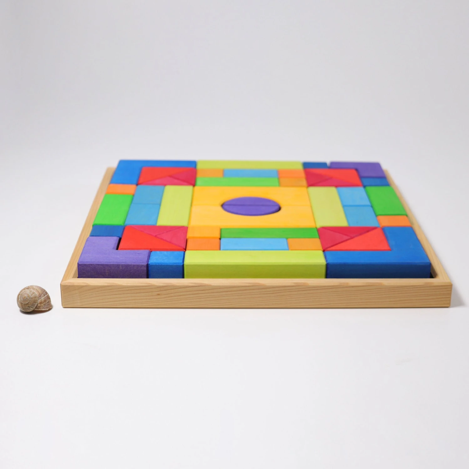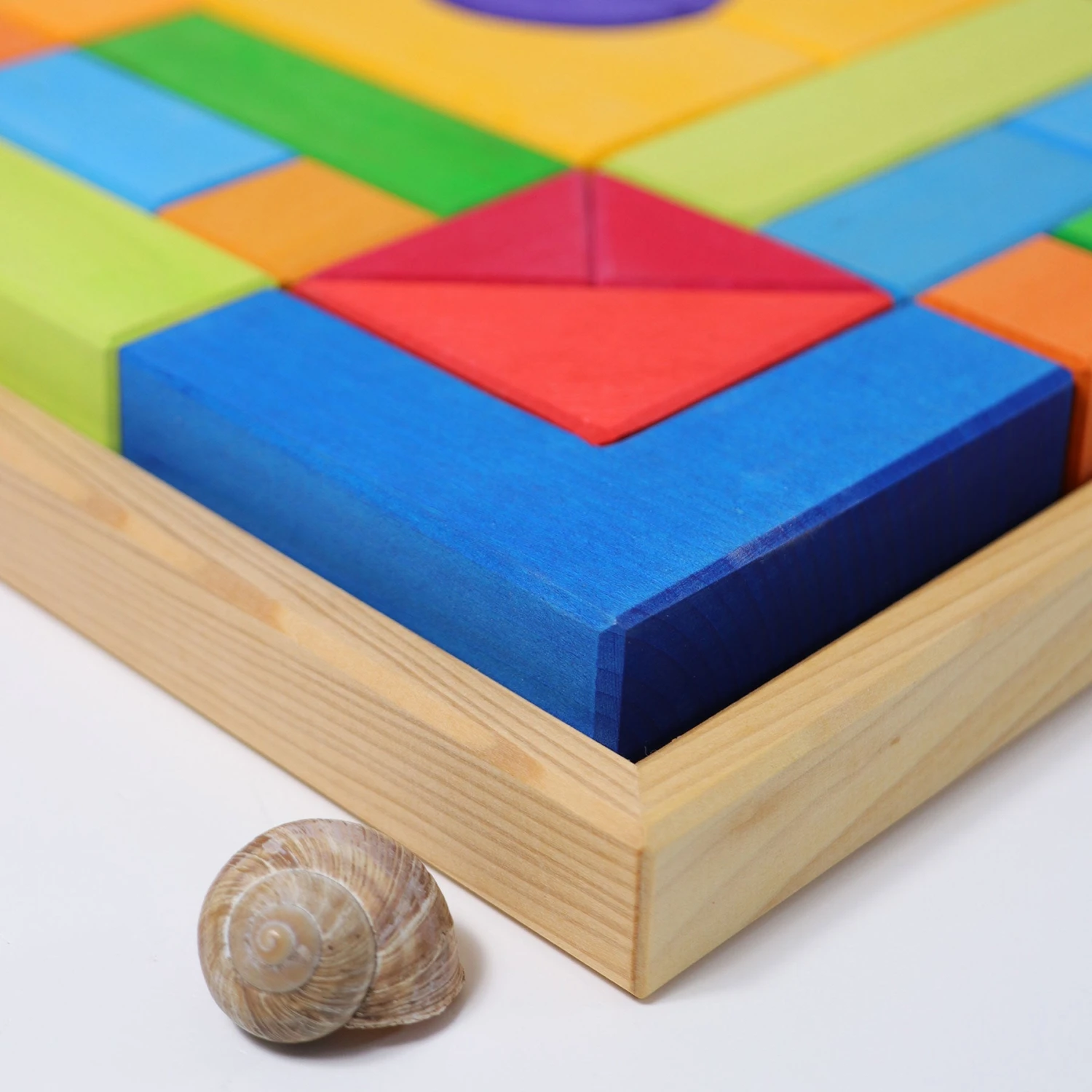 Grimm’s Standard wooden building block set comes in a 40 x 40 cm wooden frame and comprises 46 wooden blocks. A beautiful giant puzzle and a construction set in one.