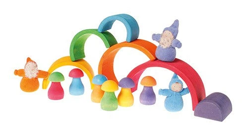 A lovely set of mushroom tops and bottoms that opens up many possibilities of play. It can be a building and sorting game where every top searches for its bottom part. Combine them with building blocks to create wonderful figurines. The Rainbow Mushrooms fits perfectly with the colours of all our Rainbow, 12 Rainbow Friends and Stacking Rainbow Bowls.