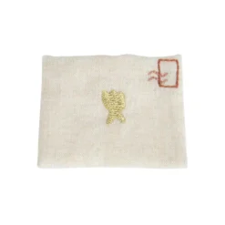 Brume mouse doll in jersey and cream chambray fabric, with her big soft ears, she is dressed in flowered panties and a pink linen blouse with a black ribbon bow around her neck.