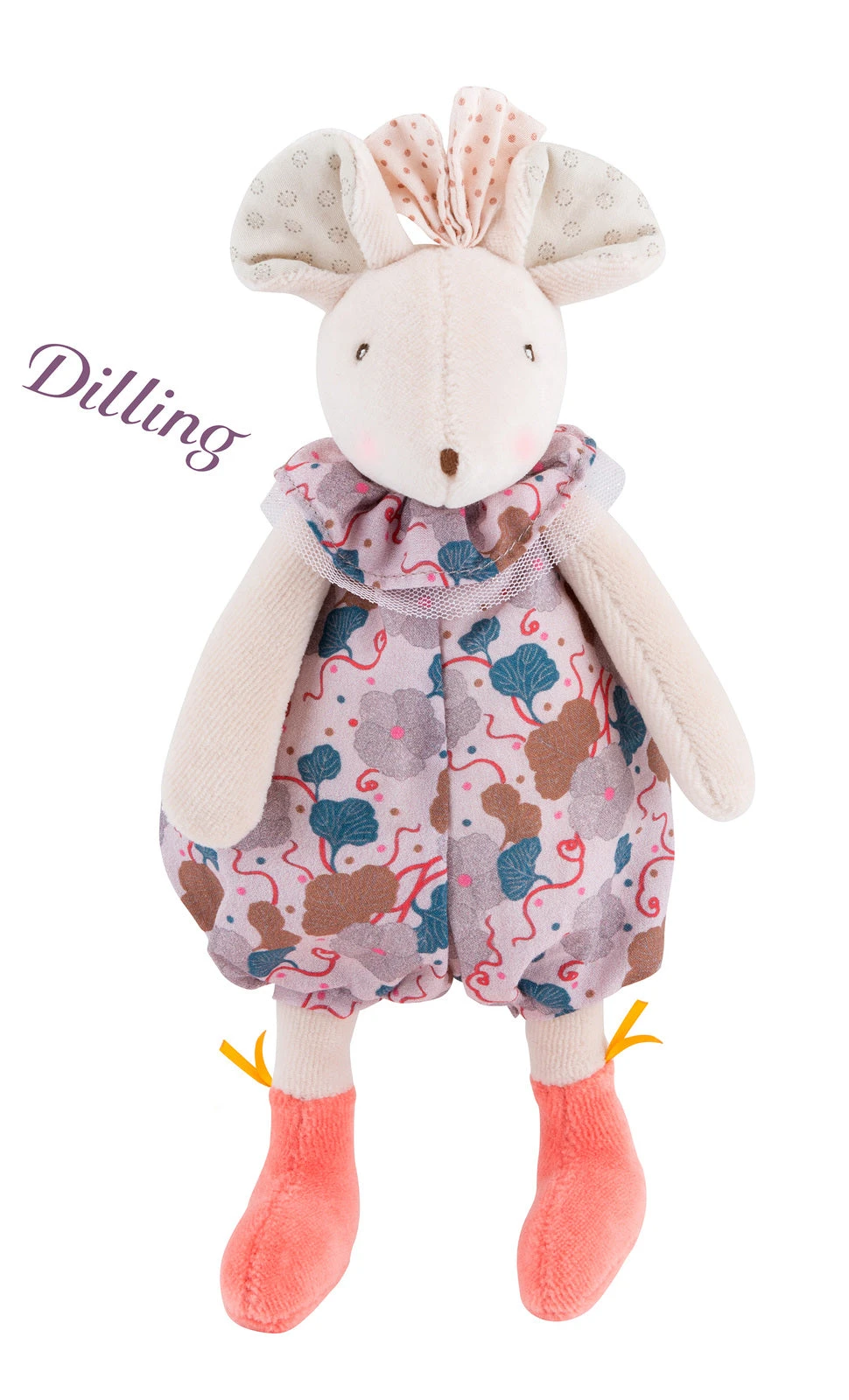 Pretty little mouse rattle ideal for little hands. This apprentice sorcerer has a polka dot bow and is dressed in a flowery cotton bloomer featuring a glittery tulle collar. This toy helps creating an interaction between baby and parents.