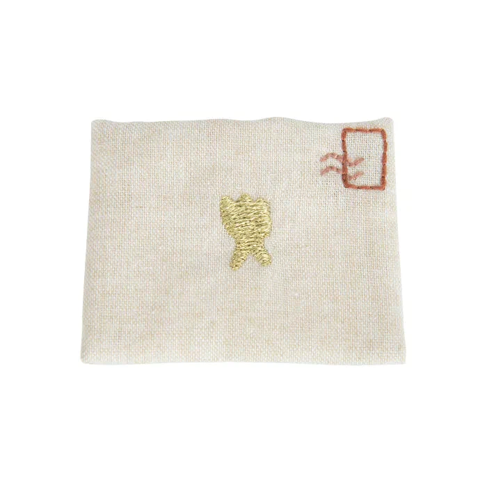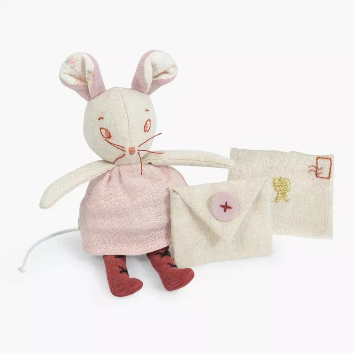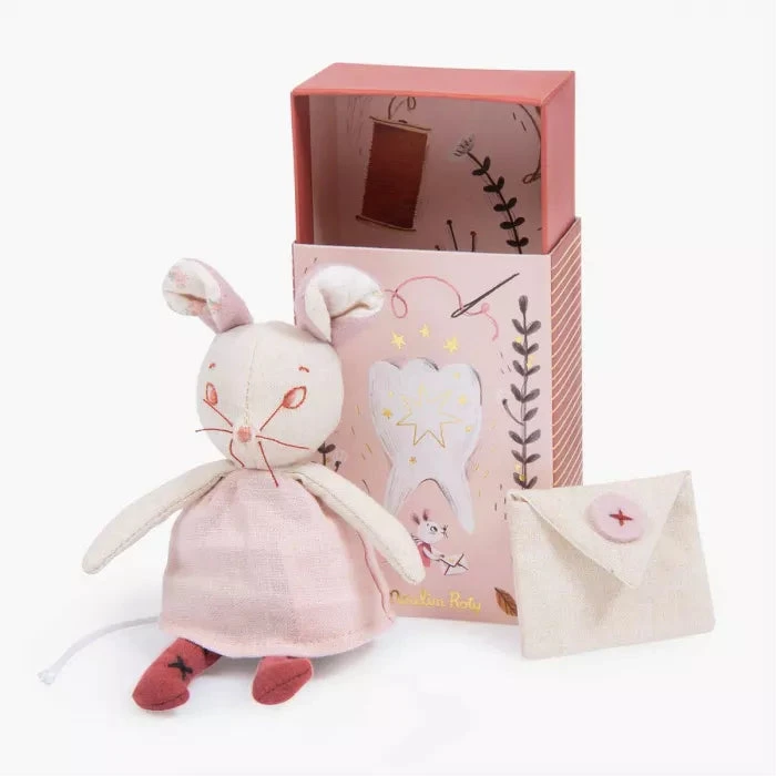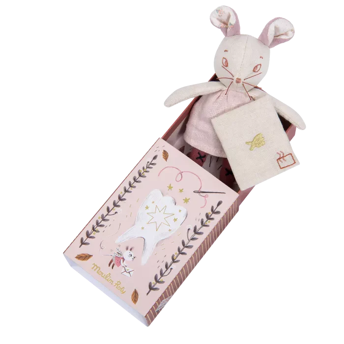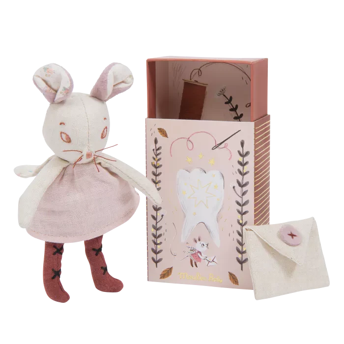 The little fairy mouse is holding a Velcro envelope with a floral interior in her hand, to store children’s milk teeth! She is dressed in a linen dress with wings in the back, her face is embroidered and her ears are made of very soft velvet.