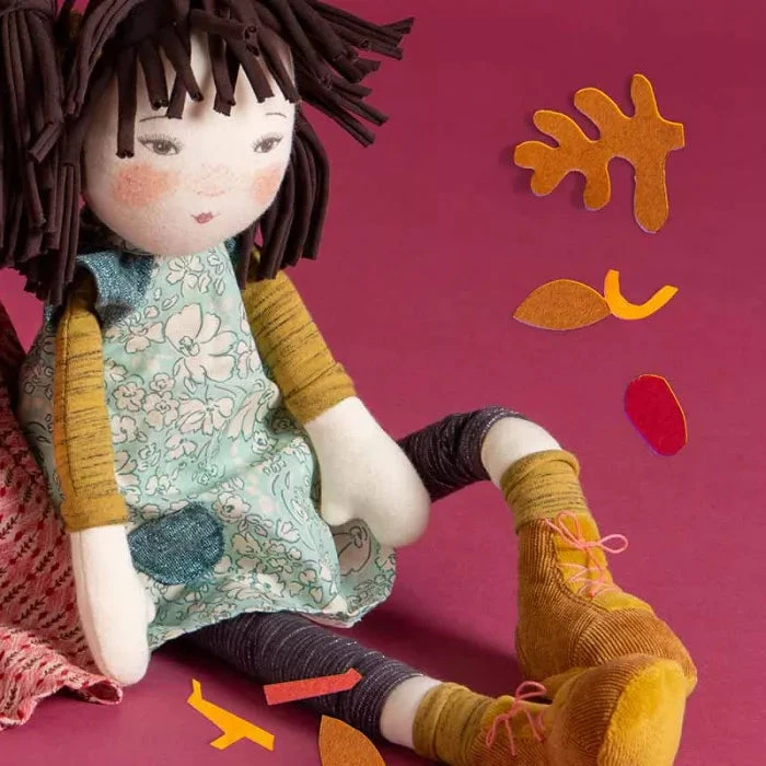 Large Iris rag doll, with a sweet illustrated and printed face, with long rolled jersey hair tied into pigtails. She is wearing lace-up ankle boots and a floral dress with pockets and leggings woven with copper thread.