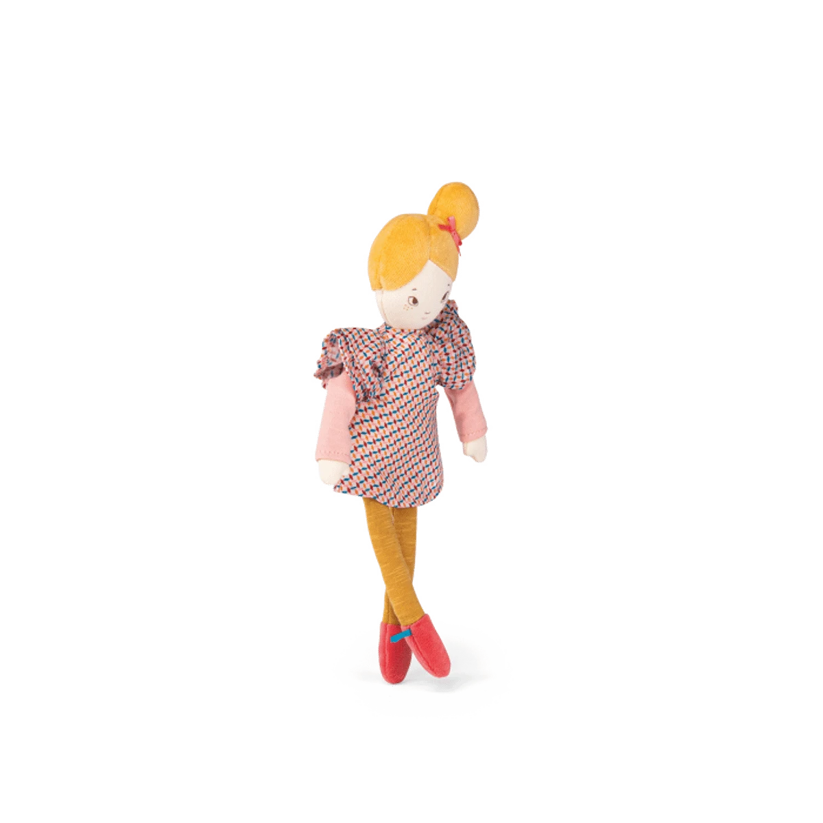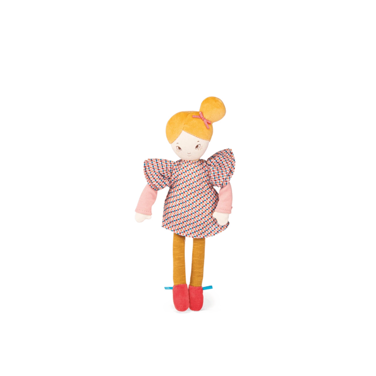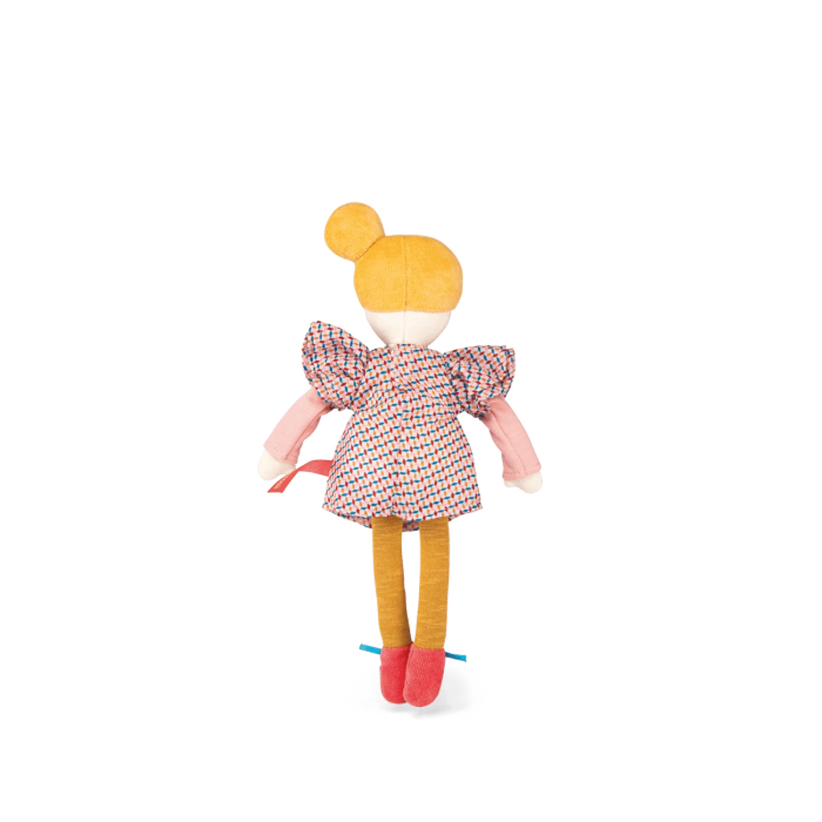 Mademoiselle Agathe is a refined little doll, very couture, who loves strolling around Paris. For sunny days, she wore her pink dress with butterfly sleeves dotted with delicate patterns, worn over mustard jersey leggings and wearing a bun.