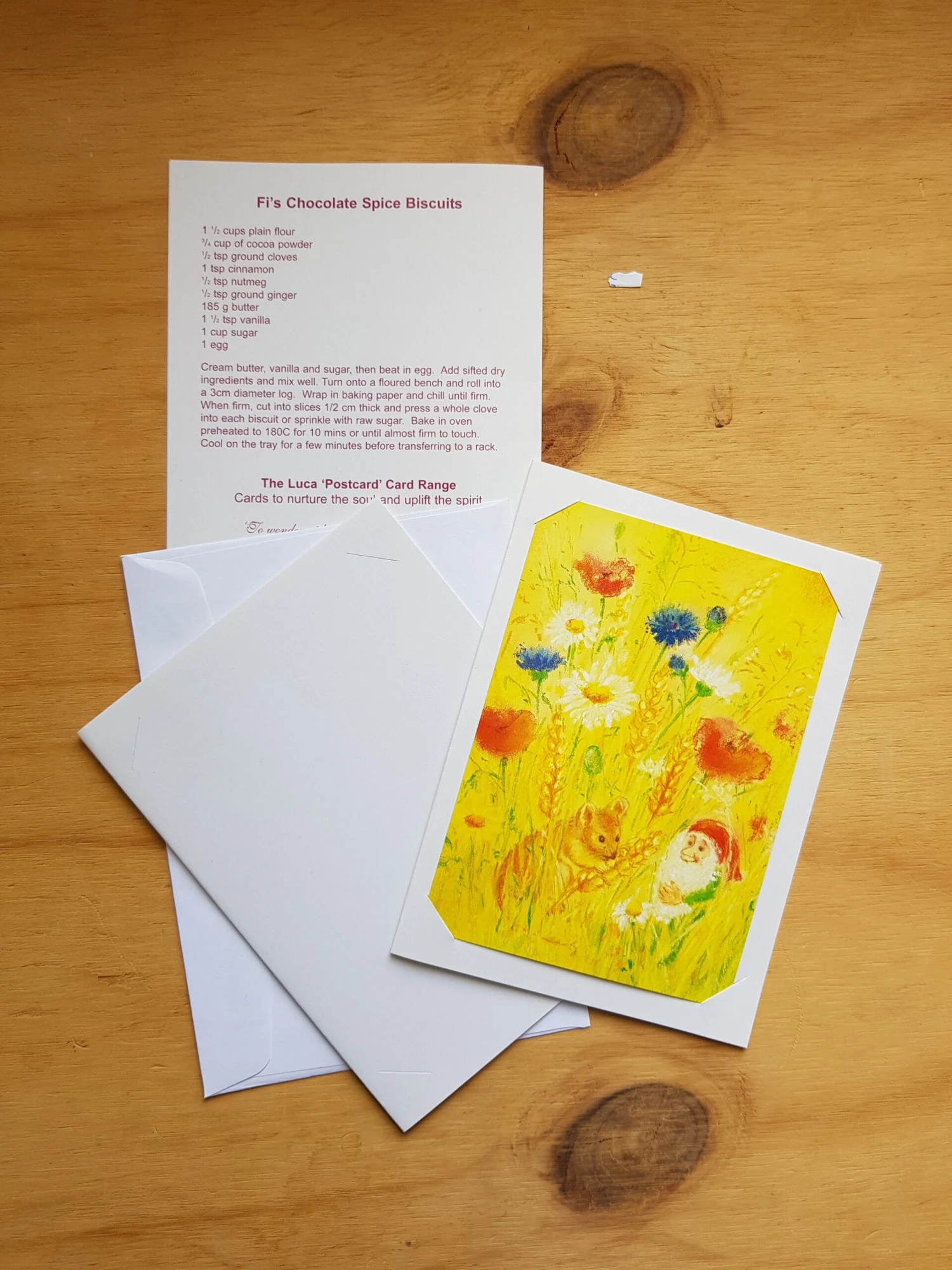 Turn your postcard or photos into a conventional folded card. Simply slide into our frame and slip into the envelope provided. Great for preserving and sending beautiful postcards and postcard that can then be removed to be put as a lovely picture. Each card/frame has a lovely recipe for ginger biscuits on the back It fits all of our postcard collection or any standard size postcard or photo.