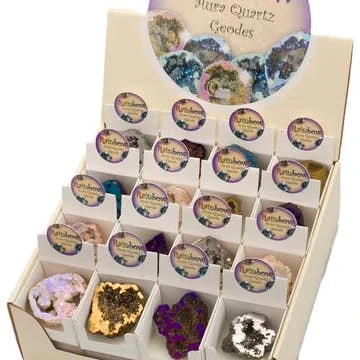 The bright, beautiful aura quartz geodes are created by bonding different metal vapours to natural quartz.