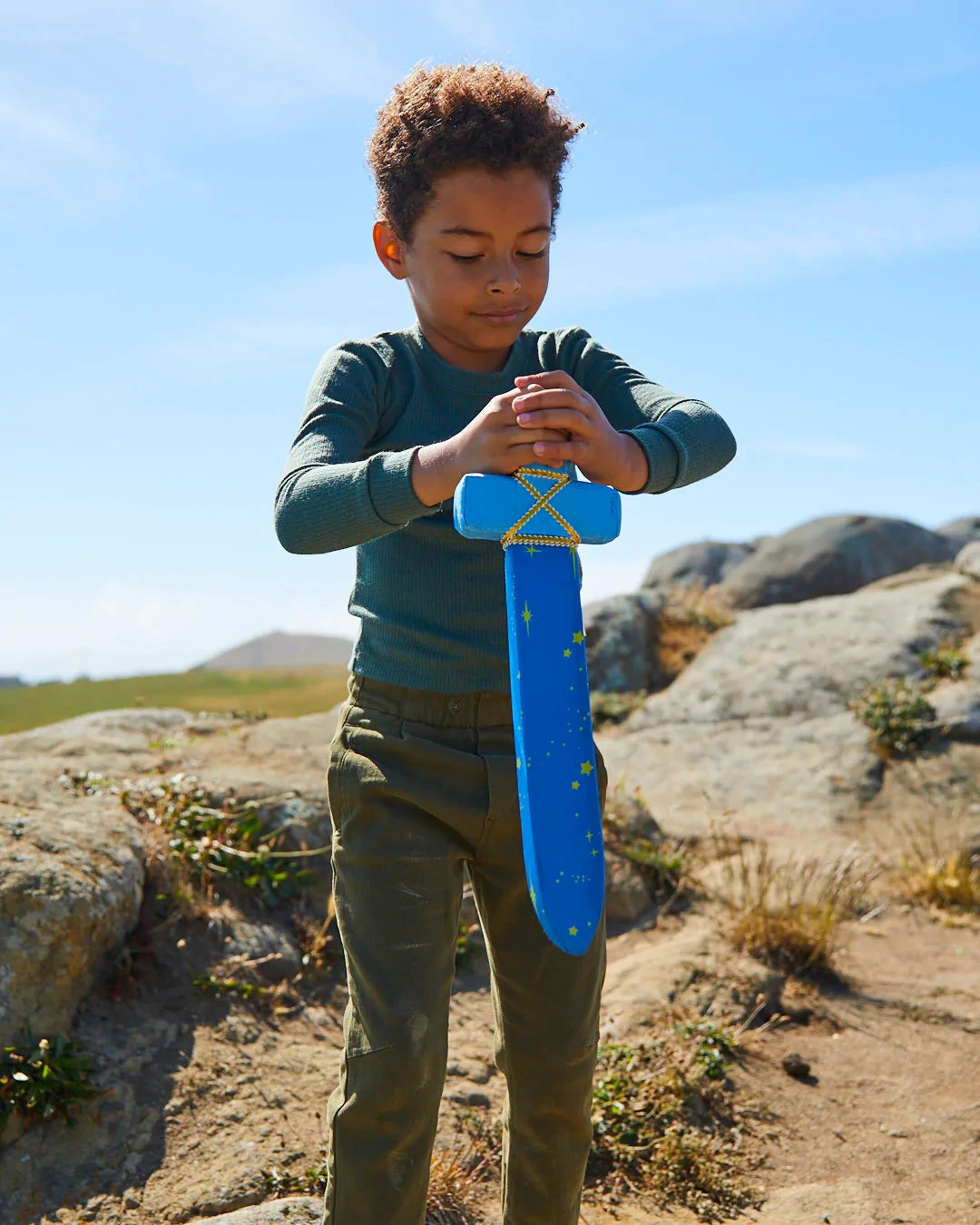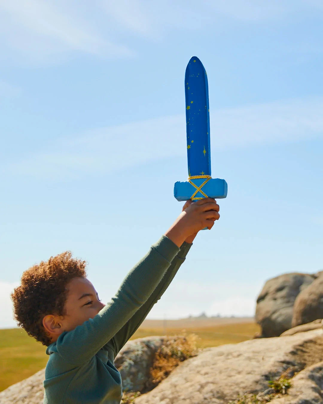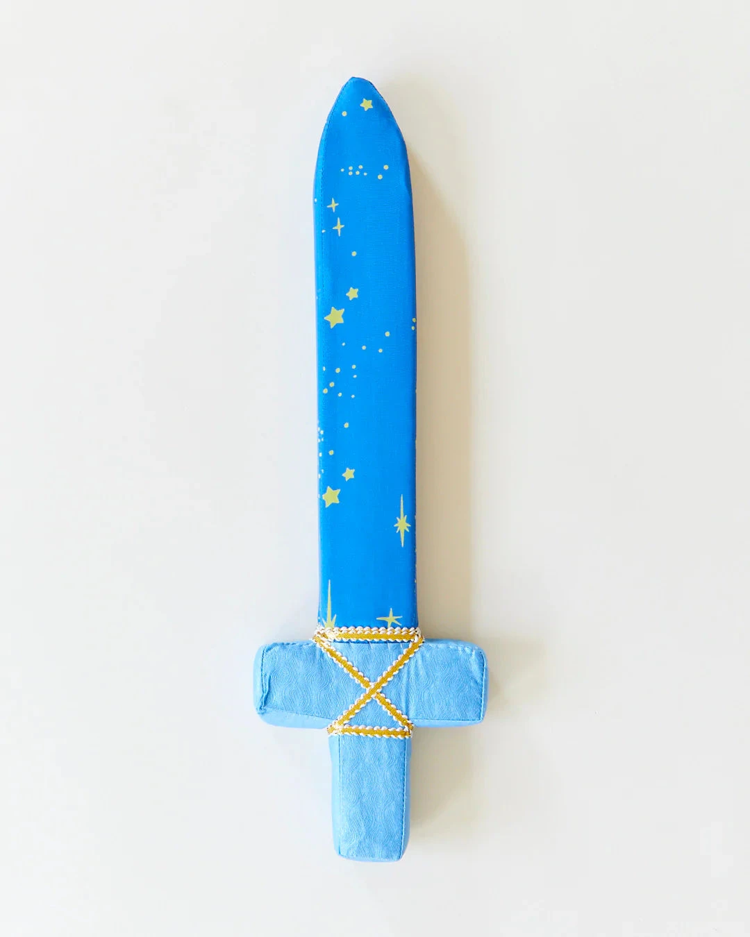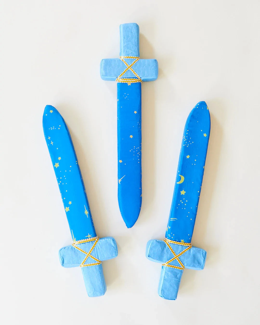 Celestial Soft Swords measure 17-inches in length and are made from soft but stiff foam. Covered with our jacquard pattern silk handle and silk ‘blade’ in our Celestial print with yellow stars.
