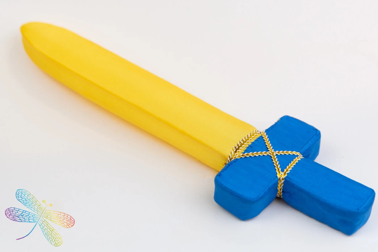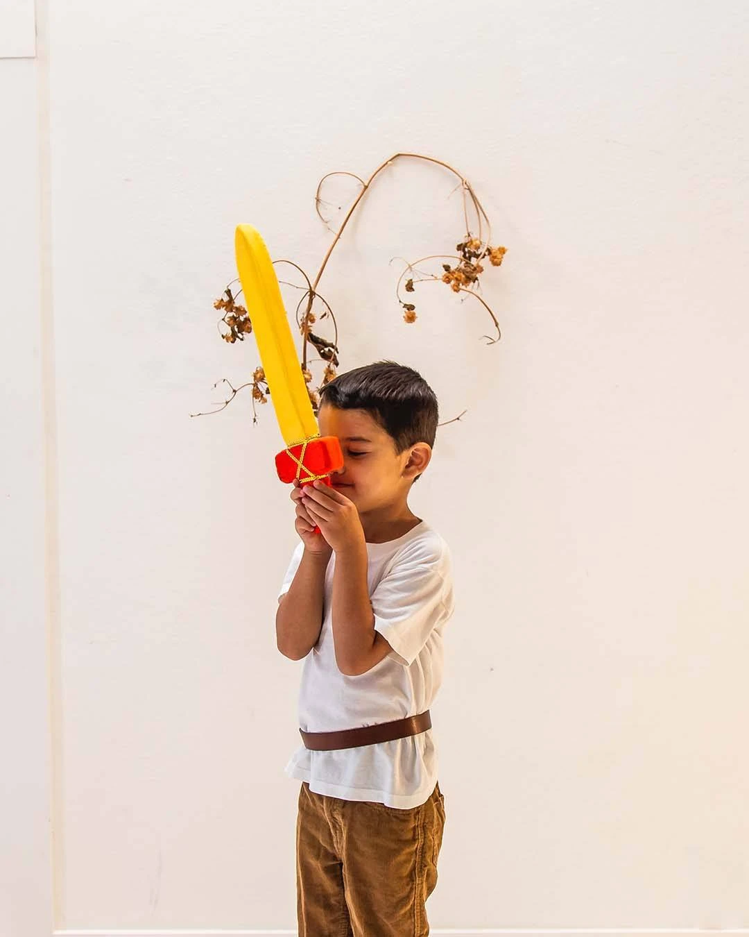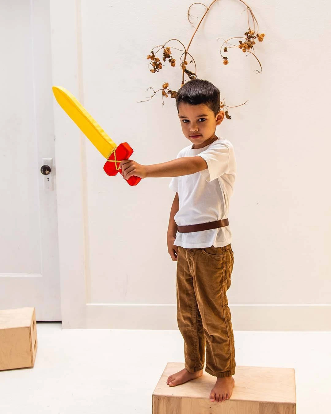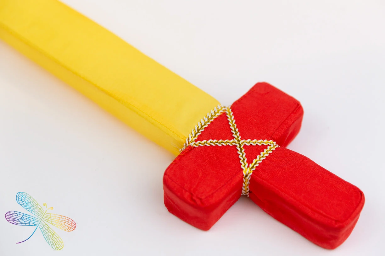 Soft but stiff foam, these swords are covered with jacquard pattern silk handle and golden silk “blade”. They match the knight costumes, crowns, and capes.