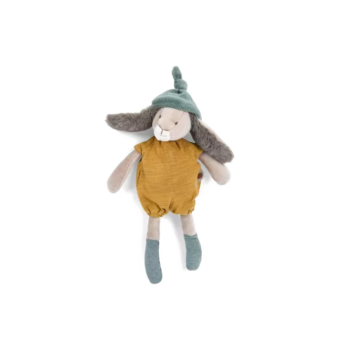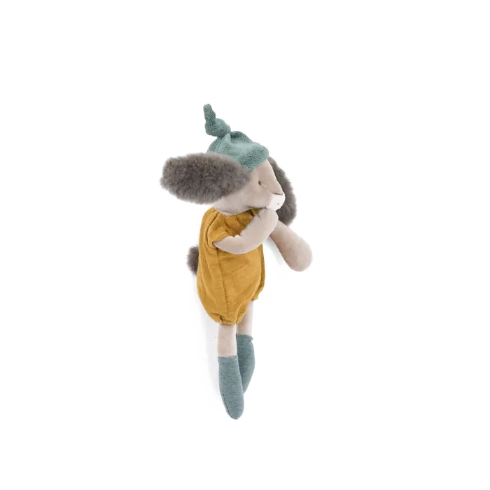 Little rabbit in terry velor, dressed in his ocher romper in slub jersey.Β With its pompom at the end of the hat, its large soft ears and its long legs, this soothing and reassuring companion is easy to catch.