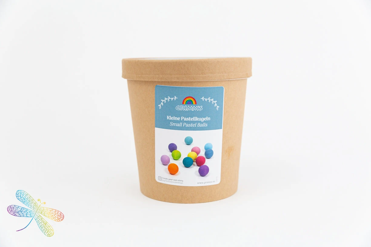 A set of 12 solid wooden balls in pastel rainbow colouring. Now the set of 4.5 cm balls have a smaller brother. More variety when building Grimm’s marble runs.