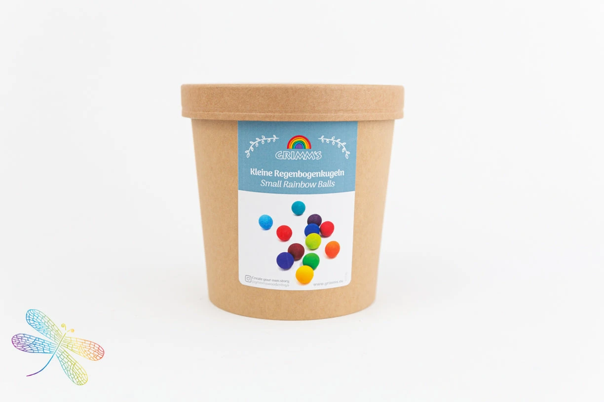 A set of 12 solid wooden balls in rainbow colouring. Now the set of 4.5 cm balls have a smaller brother. More variety when building Grimm’s marble runs.