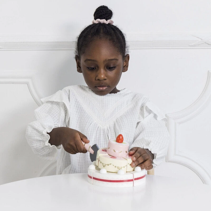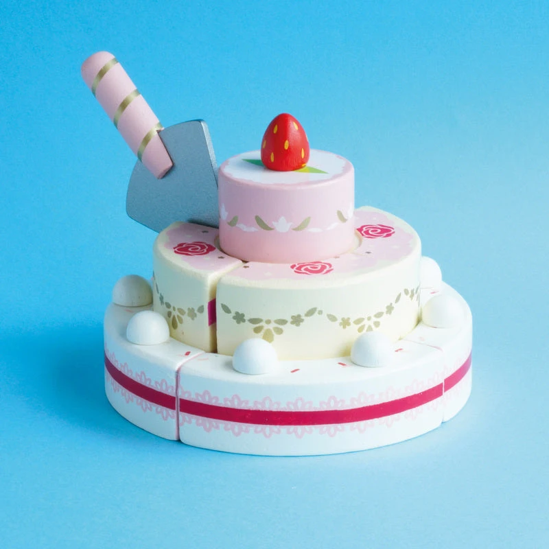 A 3 tier wedding cake that features strawberry touches throughout. The lower and mid-tier sections are made of 4 detachable pieces with Velcro. Also comes with a wooden cake slice.