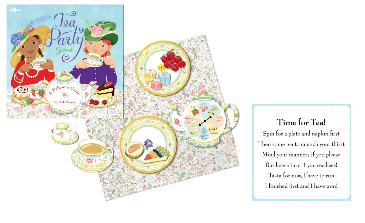 Spread the real fabric tablecloth, ready the teapot spinner, china and all the teatime treats. Time for a delicious game of Tea Party. The spinner points to tea sandwiches, desserts, fruit, tea, and the dishes to hold them. The guest who spins one in each category first wins the game, but everyone will enjoy choosing among the tempting party goodies.